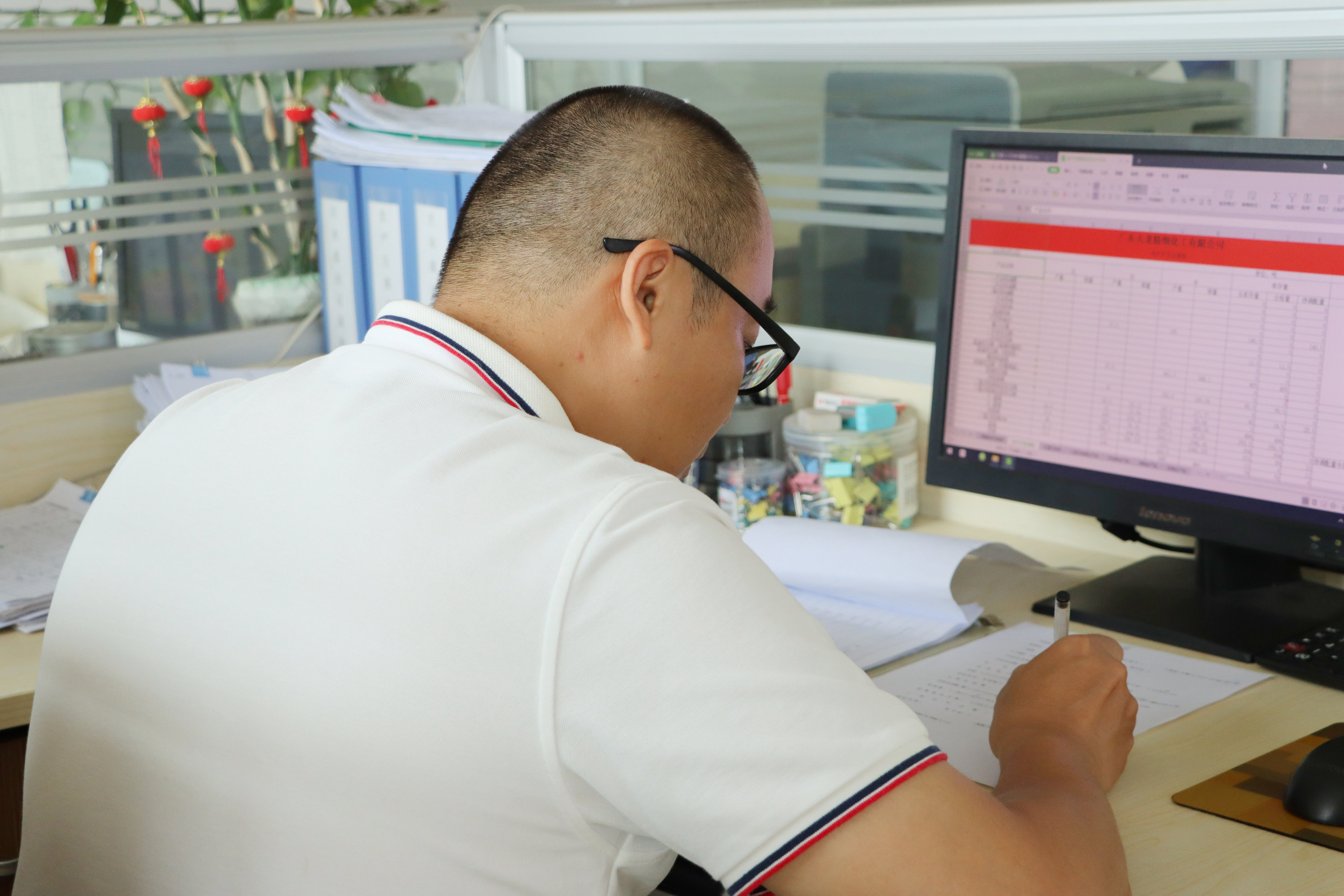 “我刚进公司的时候一个月就瘦了15斤” 江伙坚轻描淡写道,脸上洋溢着甘之如饴的笑容。此前没有从事或接触过精细化工行业及其统计工作的江伙坚,繁杂的产品和罐桶对于刚进公司的他来说显然是个不小的挑战,他时常感到迷茫和焦虑,甚至很长一段时间睡不着觉,心里想的都是如何让自己尽快的熟悉接手工作。面对身体和精神的双重压力,江伙坚并没有轻言放弃,除了通过书籍和现场学习外,同时还积极向上级领导讨教专业知识,与同事们交流工作经验,了解公司的生产流程,边学边干,在实践中总结和积累工作经验,掌握统计工作的关键要领,努力提高自己的工作效率和统计精确度。“后来大概花了半年时间我就把公司所有的产品及其对应设备了解清楚,慢慢就熟能生巧了,效率也逐步提高了。”