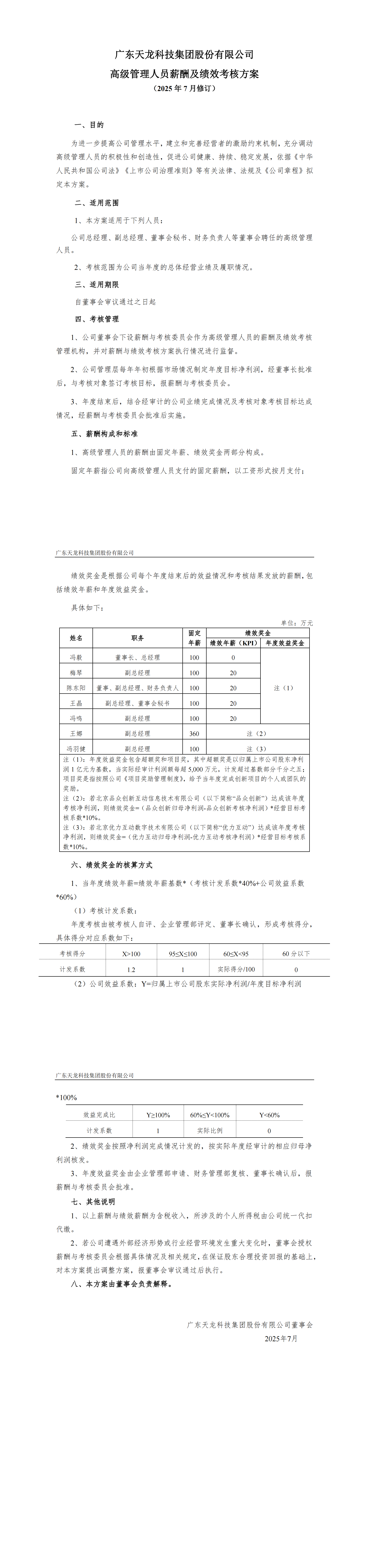 广东天龙科技集团股份有限公司高级管理人员薪酬及绩效考核方案(2025年7月)