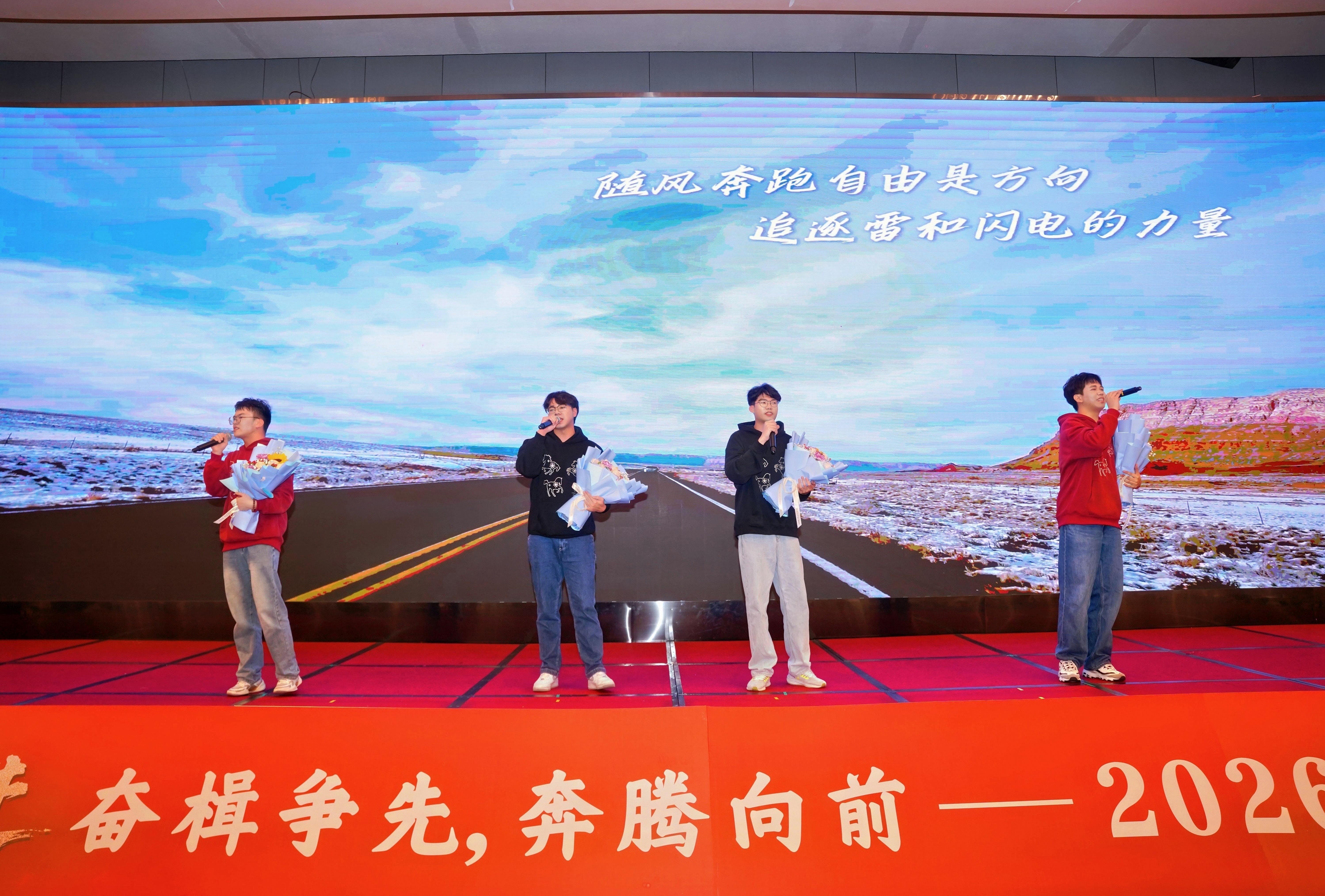 民乐演奏《盛世国乐》丝竹和鸣,古韵悠扬,大气磅礴的旋律奏响了盛世华章;歌曲《奔跑》旋律激昂、歌声嘹亮,唱出了天龙人永不停歇的奋进姿态;歌曲《一路生花》以温柔又充满力量的歌声,寄寓着对新一年发展的美好期许;歌曲串烧《夜空中最亮的星+最美的太阳》将现场氛围推向又一个小高潮;舞蹈《开门红》跳出了新年的吉祥如意,更舞出了天龙集团2026年开门大吉、蒸蒸日上的美好愿景。